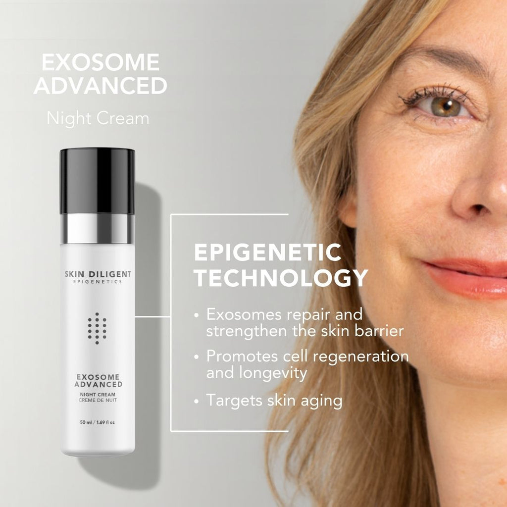 Exosome Advanced Night Cream is a light cream. Light but loaded with the latest high-tech epigenetic ingredients that support all the functions of the skin at nighttime, not just preventing excessive water loss.