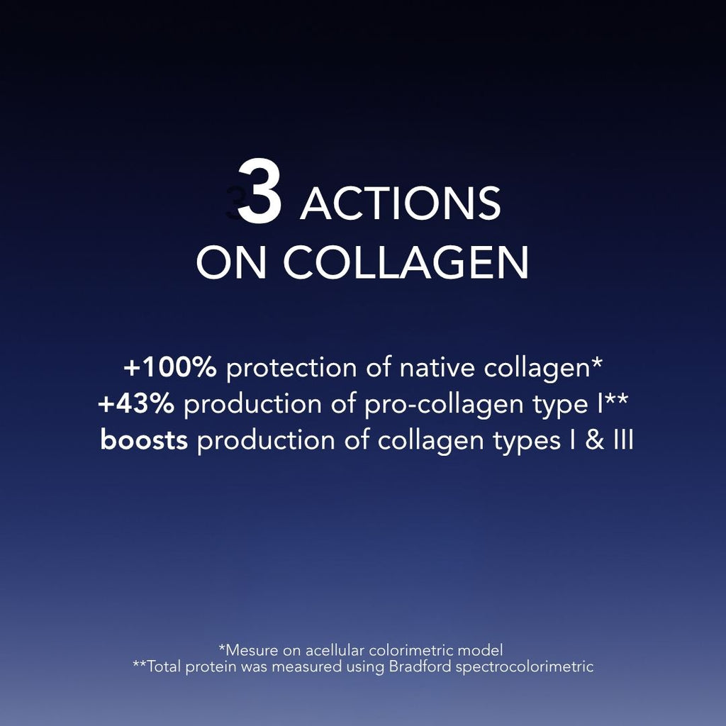 It supercharges collagen from 3 pathways - inhibits the collagenase (the enzymes that damage the collagen, therefore protects the native collagen), boosts production of collagen types I and III, and boosts production of pro-collagen.